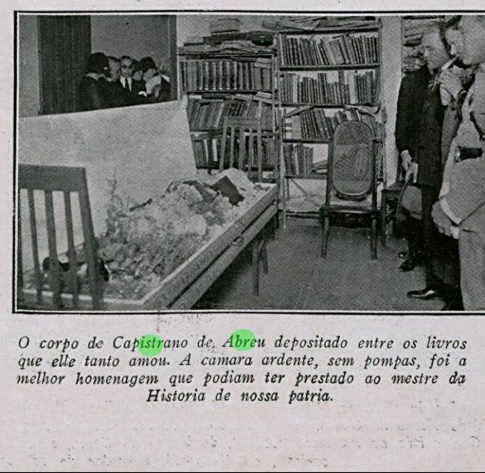 Hoje faço uma homenagem a Capistrano de Abreu, cearense e um dos maiores historiadores do seu tempo. Em busca de boas fotos dele, vasculhei a Hemeroteca da Biblioteca Nacional e cheguei às fotos de seu velório, ocorrido em sua biblioteca, na casa da Travessa Honorina, n° 45 (hoje Rua Capistrano de Abreu, n° 45, em Botafogo, no Rio de Janeiro), onde passou a maior parte da vida, em uma época de pesquisa integralmente analógica.